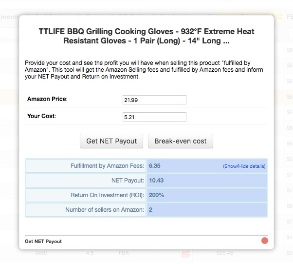Then open up the Get Net Payout icon in ASINspector to calculate your estimated net profit after all your Amazon fees are factored in: