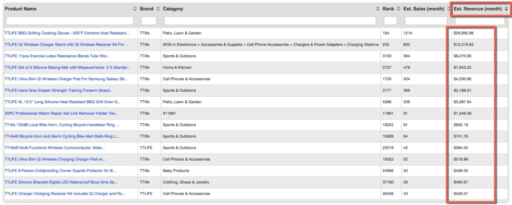 If we want to see what items are bring in the most revenue, we simply sort the Estimated Revenue (Monthly) column to order the products from most to least Revenue: