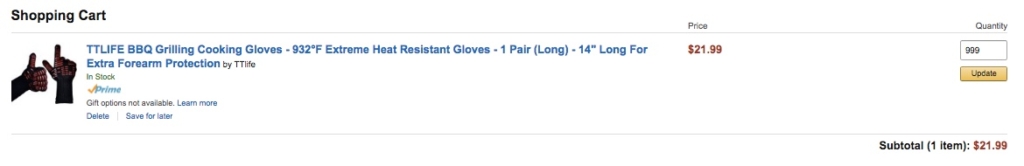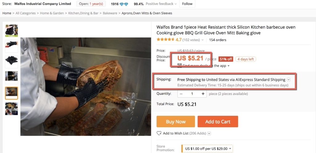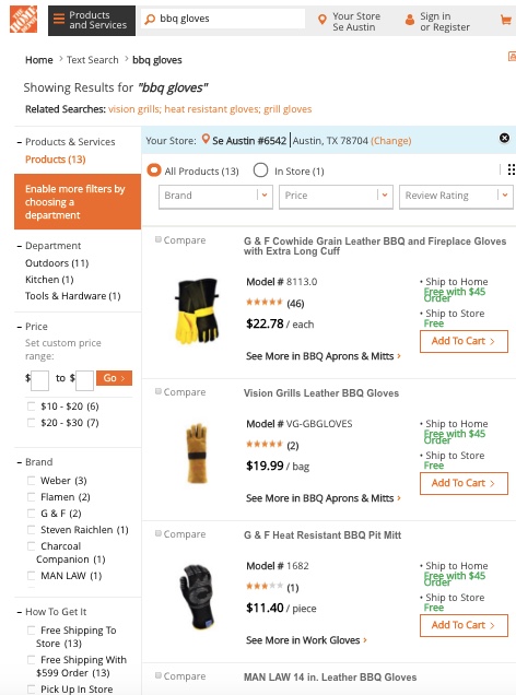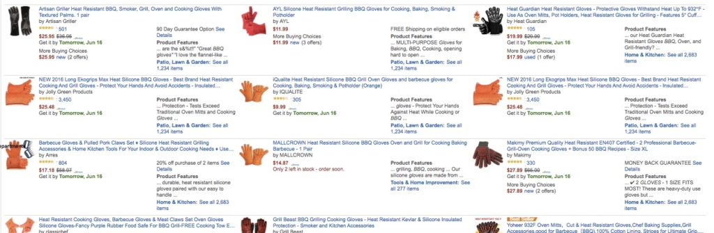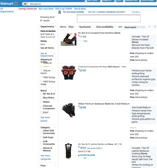 Instead, a quick search of Walmart and Home Depot for BBQ Gloves brings up several results. That means we can quickly drive out and pick up a few to sell as quickly as today: